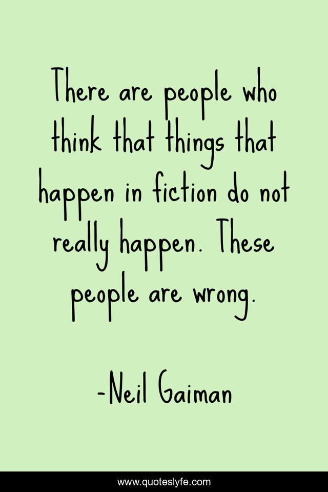This page presents the quote "There are people who think that things that happen in fiction do not really happen. These people are wrong.". Author of this quote is Neil Gaiman. This quote is about reality, writing, imagination, state-of-mind, fiction, on-fiction, inspiration,.