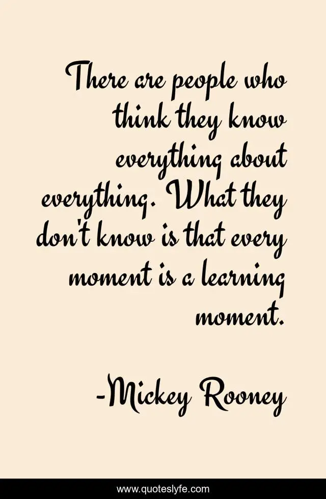 This page presents the quote "There are people who think they know everything about everything. What they don't know is that every moment is a learning moment.". Author of this quote is Mickey Rooney. This quote is about moment, people,.