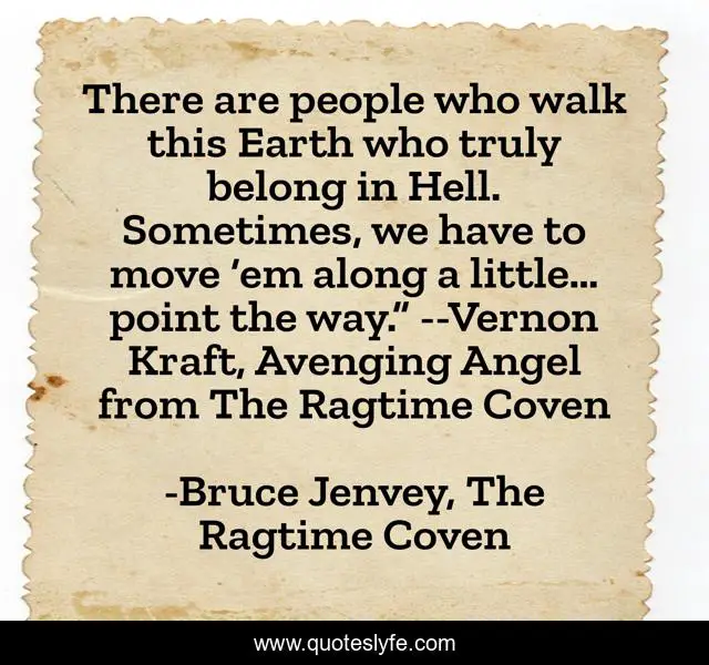 This page presents the quote "There are people who walk this Earth who truly belong in Hell. Sometimes, we have to move ‘em along a little… point the way.” --Vernon Kraft, Avenging Angel from The Ragtime Coven". Author of this quote is Bruce Jenvey, The Ragtime Coven. This quote is about angels, paranormal, witches,.