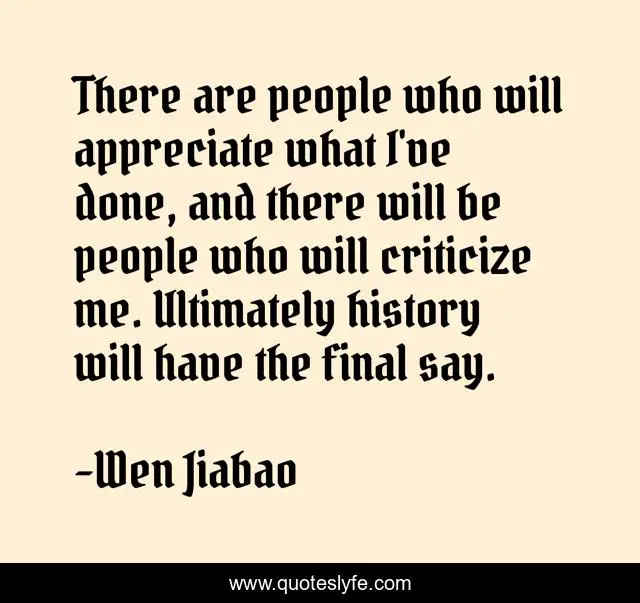 This page presents the quote "There are people who will appreciate what I've done, and there will be people who will criticize me. Ultimately history will have the final say.". Author of this quote is Wen Jiabao. This quote is about me, appreciate, people,.