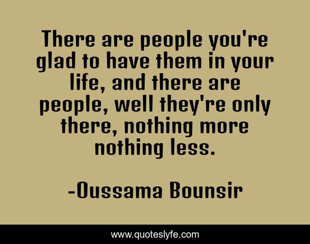 This page presents the quote "There are people you're glad to have them in your life, and there are people, well they're only there, nothing more nothing less.". Author of this quote is Oussama Bounsir. This quote is about people, life-lessons, reality,.