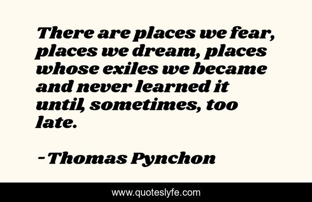 This page presents the quote "There are places we fear, places we dream, places whose exiles we became and never learned it until, sometimes, too late.". Author of this quote is Thomas Pynchon. This quote is about exile, places, memory,.