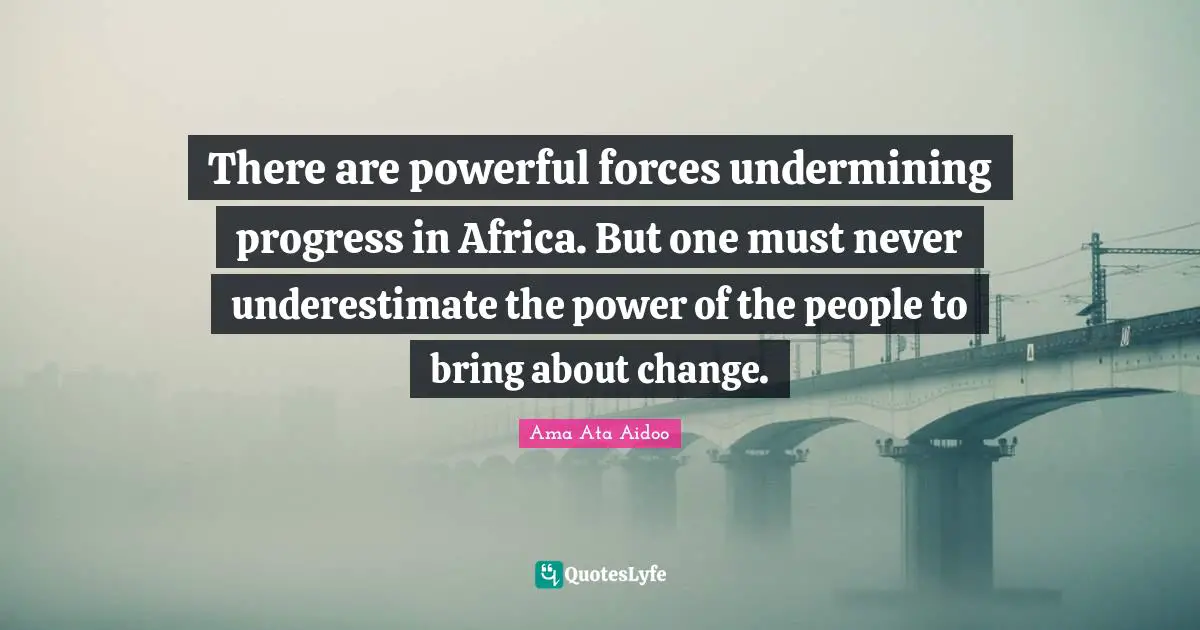 This page presents the quote "There are powerful forces undermining progress in Africa. But one must never underestimate the power of the people to bring about change.". Author of this quote is Ama Ata Aidoo. This quote is about powerful, people, power, change, never underestimate, progress,.