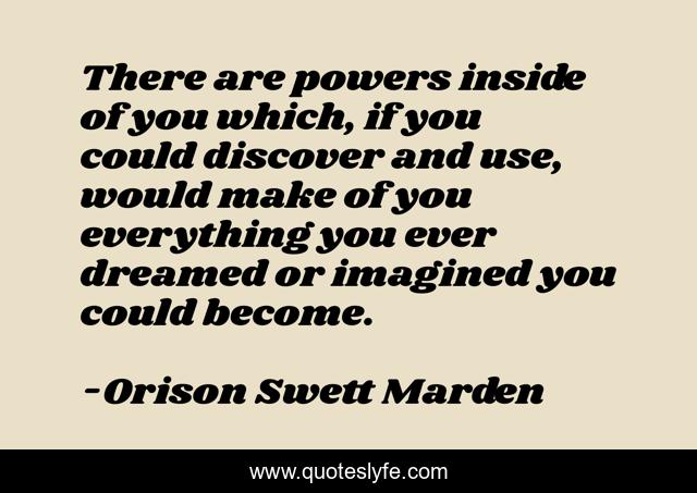 This page presents the quote "There are powers inside of you which, if you could discover and use, would make of you everything you ever dreamed or imagined you could become.". Author of this quote is Orison Swett Marden. This quote is about everything, discover,.