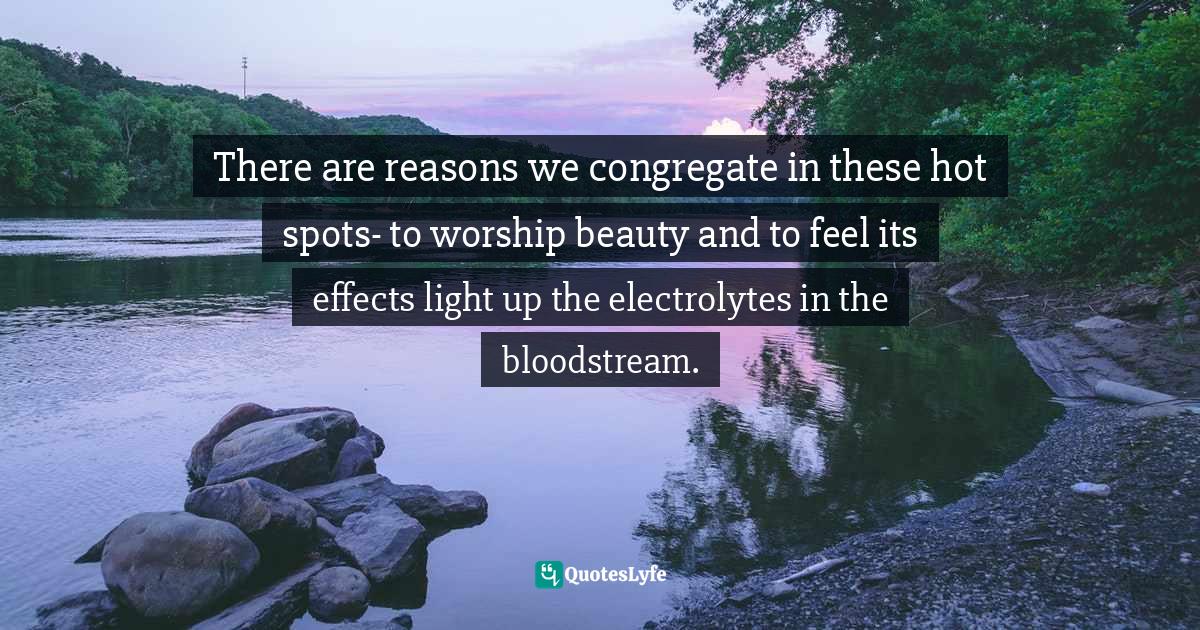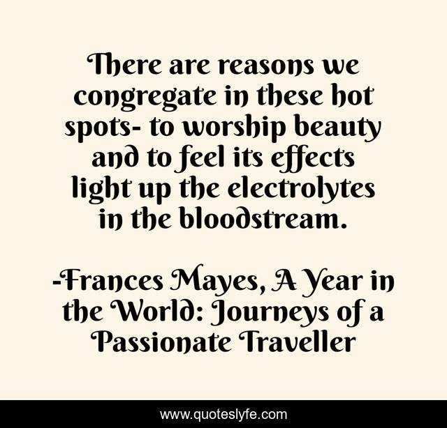 This page presents the quote "There are reasons we congregate in these hot spots- to worship beauty and to feel its effects light up the electrolytes in the bloodstream.". Author of this quote is Frances Mayes, A Year in the World: Journeys of a Passionate Traveller. This quote is about beauty-in-nature, inspiration, nature,.
