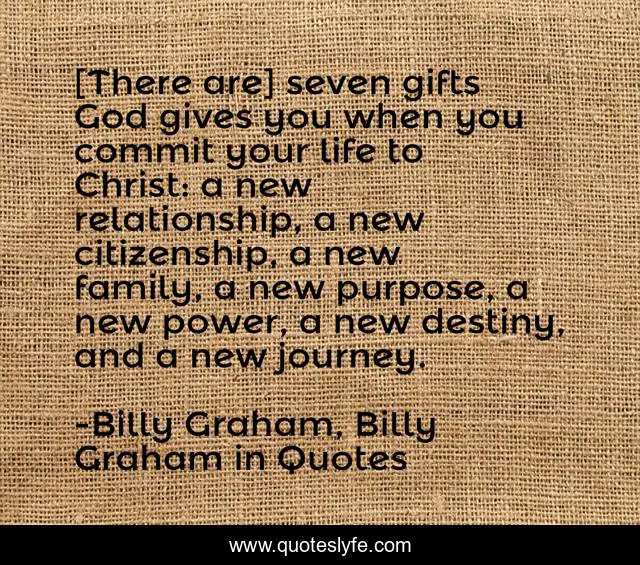 This page presents the quote "[There are] seven gifts God gives you when you commit your life to Christ: a new relationship, a new citizenship, a new family, a new purpose, a new power, a new destiny, and a new journey.". Author of this quote is Billy Graham, Billy Graham in Quotes. This quote is about god, billy-graham,.