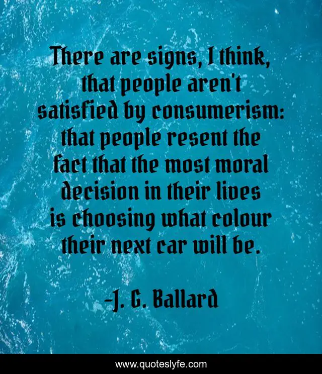 This page presents the quote "There are signs, I think, that people aren't satisfied by consumerism: that people resent the fact that the most moral decision in their lives is choosing what colour their next car will be.". Author of this quote is J. G. Ballard. This quote is about decision, moral, people,.