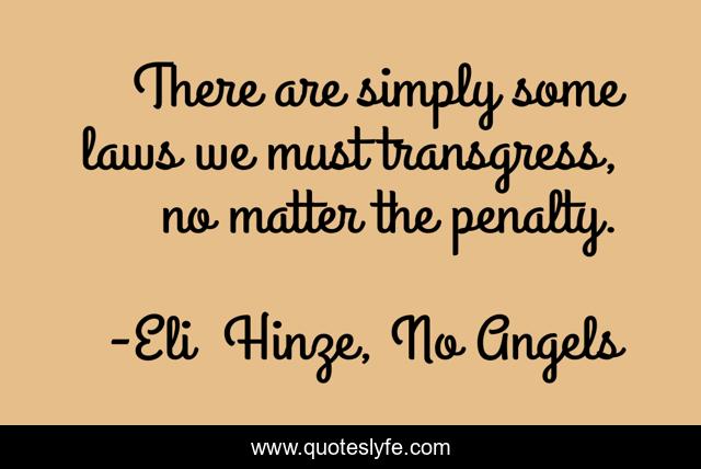 This page presents the quote "There are simply some laws we must transgress, no matter the penalty.". Author of this quote is Eli Hinze, No Angels. This quote is about fantasy, ya-fantasy, romance, no-angels, adventure, eli-hinze, young-adult, action,.