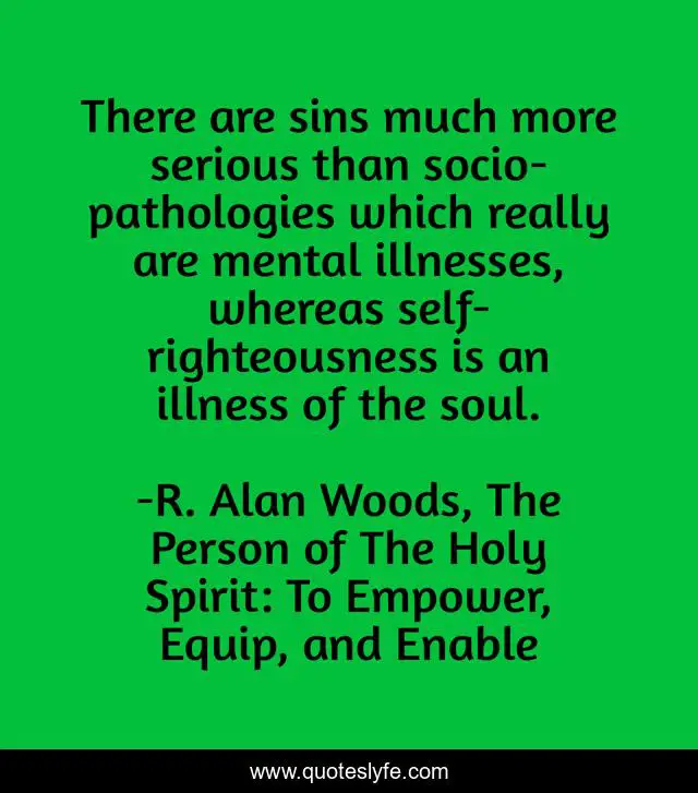 This page presents the quote "There are sins much more serious than socio-pathologies which really are mental illnesses, whereas self-righteousness is an illness of the soul.". Author of this quote is R. Alan Woods, The Person of The Holy Spirit: To Empower, Equip, and Enable. This quote is about self-righteousness, soul-sick, sociopathology, sins, r-alan-woods, sociopaths, mental-illness,.