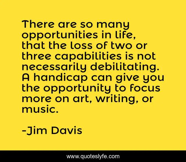 This page presents the quote "There are so many opportunities in life, that the loss of two or three capabilities is not necessarily debilitating. A handicap can give you the opportunity to focus more on art, writing, or music.". Author of this quote is Jim Davis. This quote is about art, life, opportunity,.