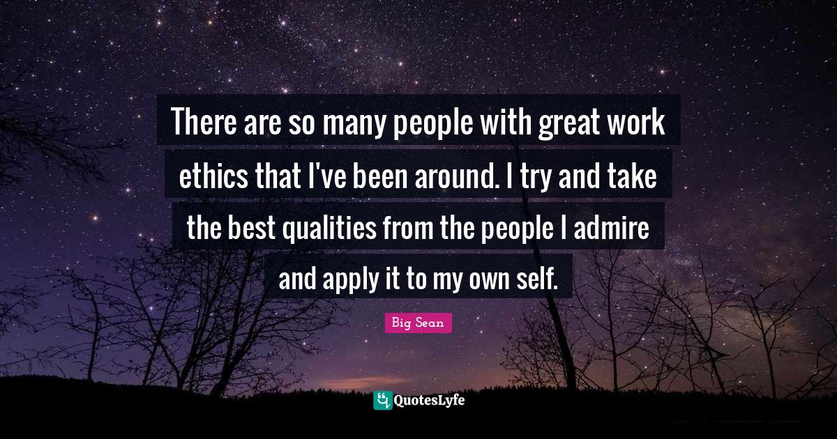This page presents the quote "There are so many people with great work ethics that I've been around. I try and take the best qualities from the people I admire and apply it to my own self.". Author of this quote is Big Sean. This quote is about work ethic, admire, ethics, my own, people, great work, self,.