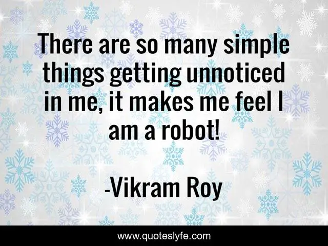 This page presents the quote "There are so many simple things getting unnoticed in me, it makes me feel I am a robot!". Author of this quote is Vikram Roy. This quote is about philosophy-of-life, philosophy, city-life, modern-life,.