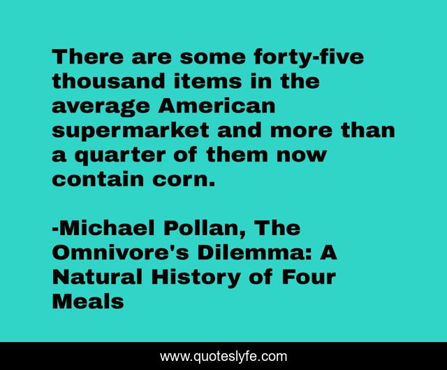 This page presents the quote "There are some forty-five thousand items in the average American supermarket and more than a quarter of them now contain corn.". Author of this quote is Michael Pollan, The Omnivore's Dilemma: A Natural History of Four Meals. .