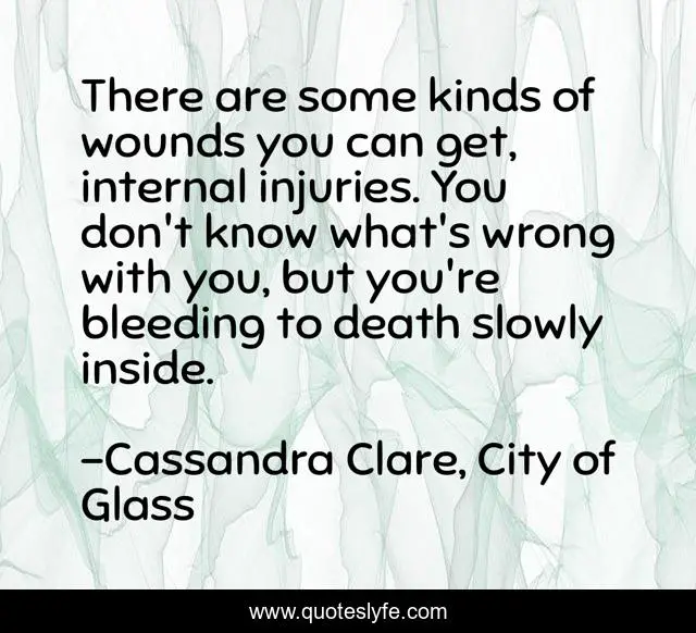 This page presents the quote "There are some kinds of wounds you can get, internal injuries. You don't know what's wrong with you, but you're bleeding to death slowly inside.". Author of this quote is Cassandra Clare, City of Glass. This quote is about love, life-lessons, affection,.