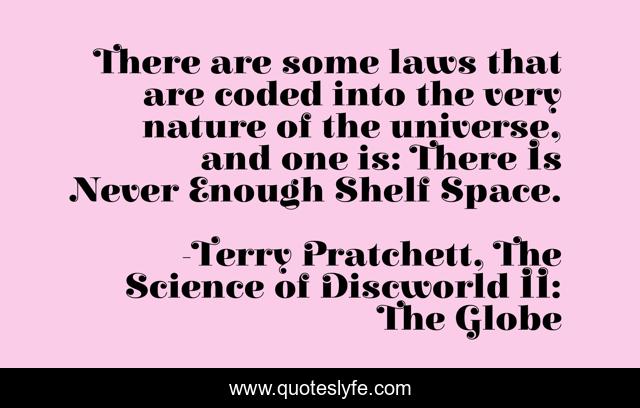 This page presents the quote "There are some laws that are coded into the very nature of the universe, and one is: There Is Never Enough Shelf Space.". Author of this quote is Terry Pratchett, The Science of Discworld II: The Globe. This quote is about laws, books, space, humour, nature,.