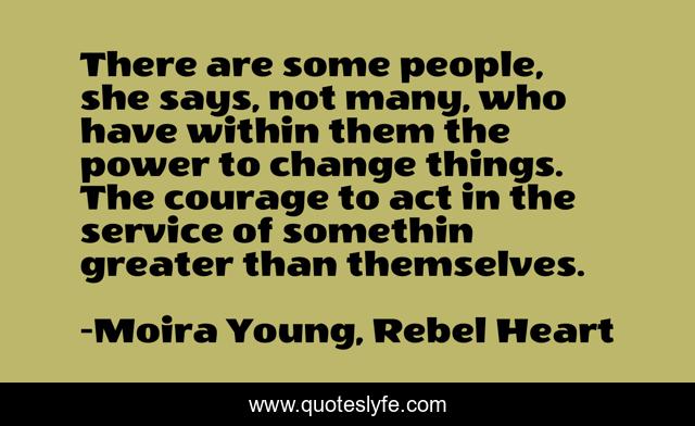 This page presents the quote "There are some people, she says, not many, who have within them the power to change things. The courage to act in the service of somethin greater than themselves.". Author of this quote is Moira Young, Rebel Heart. This quote is about change, courage, power, service,.