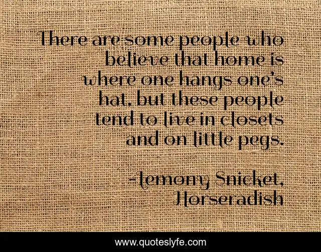 This page presents the quote "There are some people who believe that home is where one hangs one's hat, but these people tend to live in closets and on little pegs.". Author of this quote is Lemony Snicket, Horseradish. .