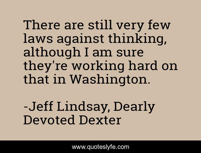 This page presents the quote "There are still very few laws against thinking, although I am sure they're working hard on that in Washington.". Author of this quote is Jeff Lindsay, Dearly Devoted Dexter. This quote is about thinking, intelligence,.