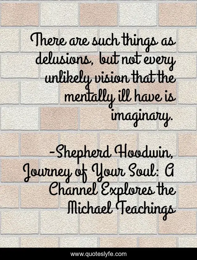 This page presents the quote "There are such things as delusions, but not every unlikely vision that the mentally ill have is imaginary.". Author of this quote is Shepherd Hoodwin, Journey of Your Soul: A Channel Explores the Michael Teachings. This quote is about psychic-abilities, channeling, mental-illness, soul,.