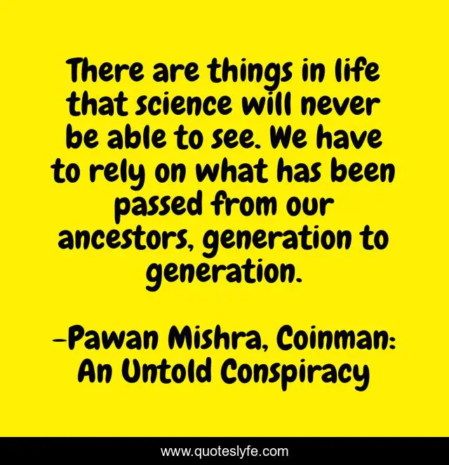 This page presents the quote "There are things in life that science will never be able to see. We have to rely on what has been passed from our ancestors, generation to generation.". Author of this quote is Pawan Mishra, Coinman: An Untold Conspiracy. This quote is about ancestors, knowledge, family, science, reliance, history,.