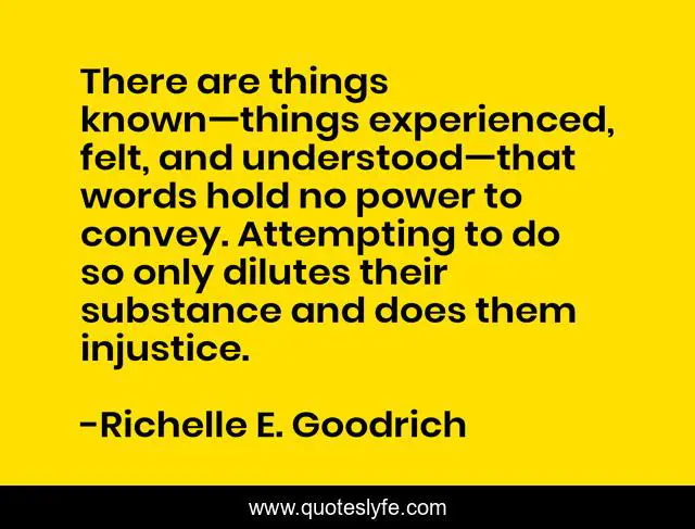 This page presents the quote "There are things known—things experienced, felt, and understood—that words hold no power to convey. Attempting to do so only dilutes their substance and does them injustice.". Author of this quote is Richelle E. Goodrich. This quote is about truths, understanding, richelle, words, richelle-goodrich, writing, experiences,.