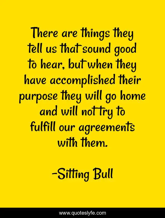 This page presents the quote "There are things they tell us that sound good to hear, but when they have accomplished their purpose they will go home and will not try to fulfill our agreements with them.". Author of this quote is Sitting Bull. This quote is about try, good, purpose,.