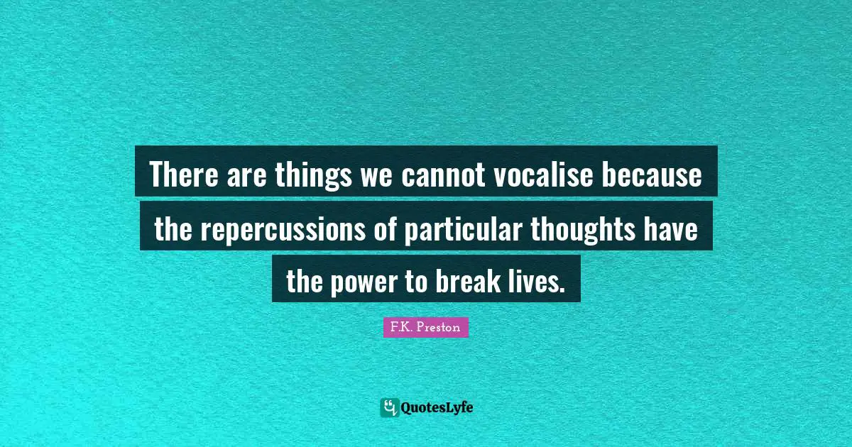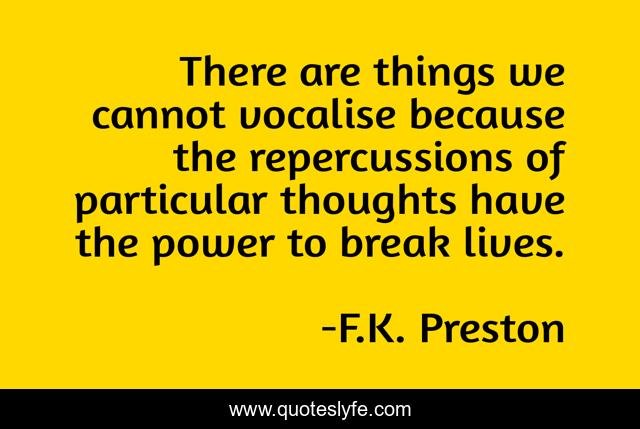 This page presents the quote "There are things we cannot vocalise because the repercussions of particular thoughts have the power to break lives.". Author of this quote is F.K. Preston. This quote is about thinking, life, philosophy, perspective, thoughts,.