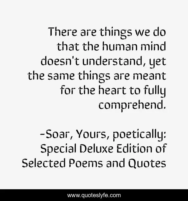 This page presents the quote "There are things we do that the human mind doesn't understand, yet the same things are meant for the heart to fully comprehend.". Author of this quote is Soar, Yours, poetically: Special Deluxe Edition of Selected Poems and Quotes. This quote is about heart, life, love, people, poetry, affection,.