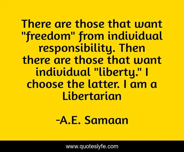 This page presents the quote "There are those that want "freedom" from individual responsibility. Then there are those that want individual "liberty." I choose the latter. I am a Libertarian". Author of this quote is A.E. Samaan. This quote is about libertarian-party, individual-responsibility, libertarianism, liberty, individual-liberty, freedom, libertarian,.