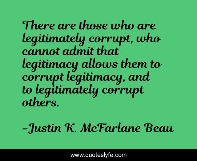 This page presents the quote "There are those who are legitimately corrupt, who cannot admit that legitimacy allows them to corrupt legitimacy, and to legitimately corrupt others.". Author of this quote is Justin K. McFarlane Beau. This quote is about accomodation, law, paradox, vile, vice, illegal, irony, unavoidable, chaos,.