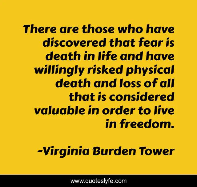 This page presents the quote "There are those who have discovered that fear is death in life and have willingly risked physical death and loss of all that is considered valuable in order to live in freedom.". Author of this quote is Virginia Burden Tower. .