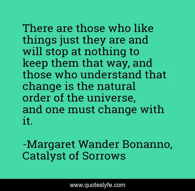 This page presents the quote "There are those who like things just they are and will stop at nothing to keep them that way, and those who understand that change is the natural order of the universe, and one must change with it.". Author of this quote is Margaret Wander Bonanno, Catalyst of Sorrows. This quote is about universe, unchanged, sci-fi, change,.