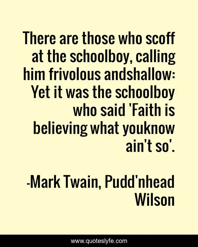 This page presents the quote "There are those who scoff at the schoolboy, calling him frivolous andshallow: Yet it was the schoolboy who said 'Faith is believing what youknow ain't so'.". Author of this quote is Mark Twain, Pudd'nhead Wilson. This quote is about faith, wit, humor,.
