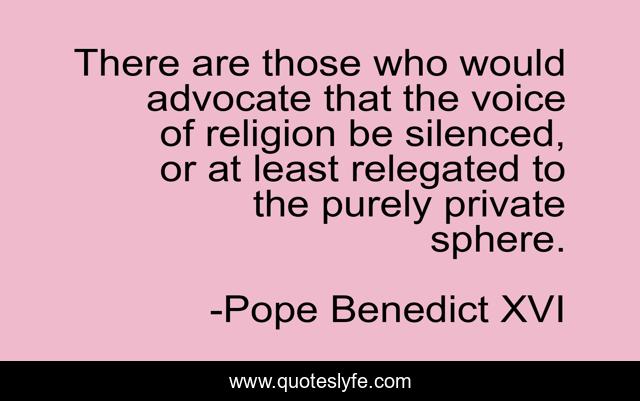 This page presents the quote "There are those who would advocate that the voice of religion be silenced, or at least relegated to the purely private sphere.". Author of this quote is Pope Benedict XVI. This quote is about voice, purely, advocate,.