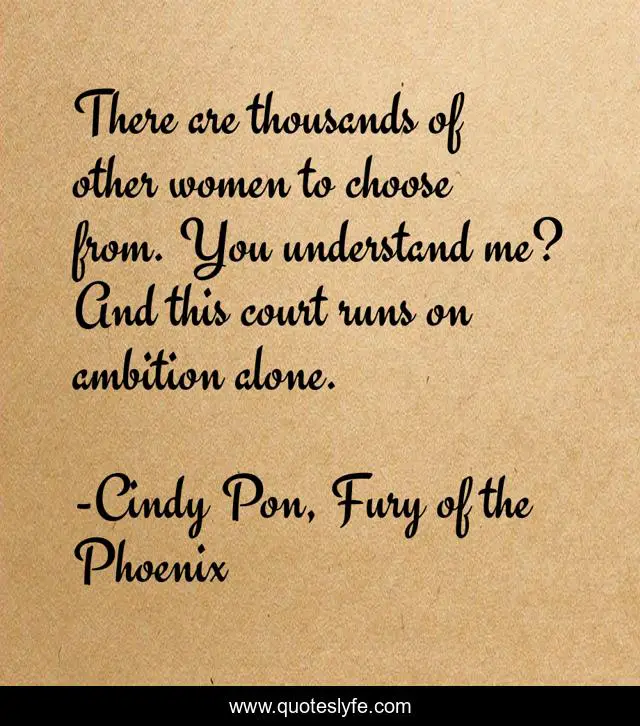 This page presents the quote "There are thousands of other women to choose from. You understand me? And this court runs on ambition alone.". Author of this quote is Cindy Pon, Fury of the Phoenix. This quote is about ya, fantasy, asian,.