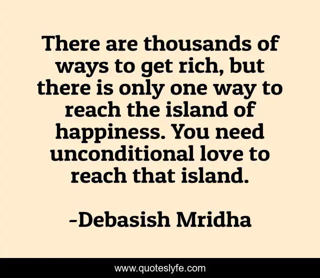 This page presents the quote "There are thousands of ways to get rich, but there is only one way to reach the island of happiness. You need unconditional love to reach that island.". Author of this quote is Debasish Mridha. This quote is about unconditional-love, how-to-get-rich, philosophy, debasish-mridha, quotes, inspirational, island-of-happiness, enthusiasm, debasish-mridha-m-d,.