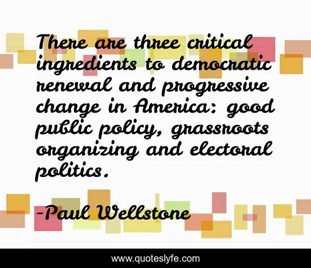 This page presents the quote "There are three critical ingredients to democratic renewal and progressive change in America: good public policy, grassroots organizing and electoral politics.". Author of this quote is Paul Wellstone. This quote is about good, america, change,.