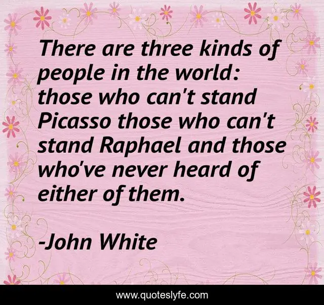 This page presents the quote "There are three kinds of people in the world: those who can't stand Picasso those who can't stand Raphael and those who've never heard of either of them.". Author of this quote is John White. This quote is about painters, painting,.