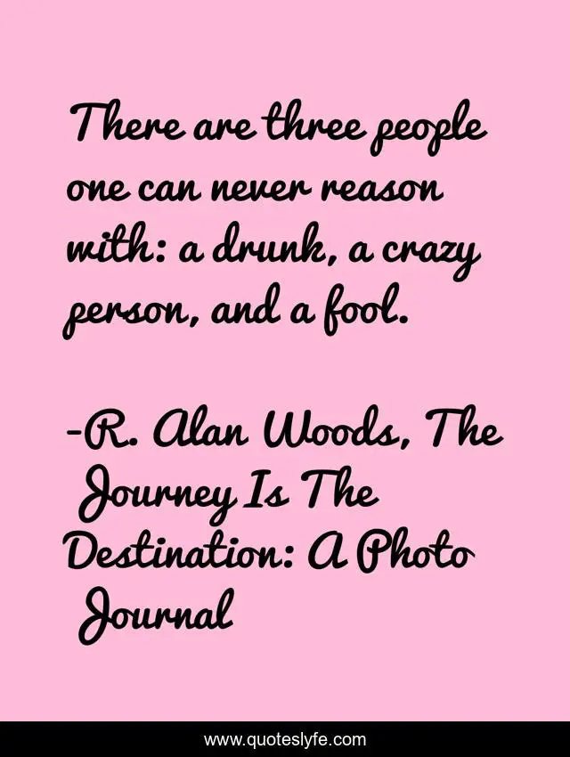 This page presents the quote "There are three people one can never reason with: a drunk, a crazy person, and a fool.". Author of this quote is R. Alan Woods, The Journey Is The Destination: A Photo Journal. This quote is about reason, r-alan-woods, reasoning, reasonable,.