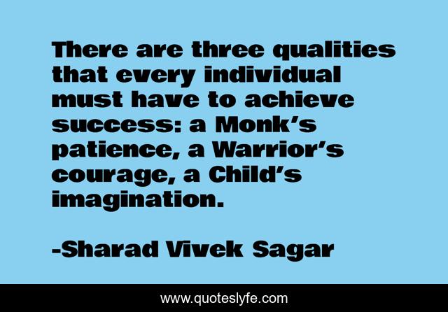 This page presents the quote "There are three qualities that every individual must have to achieve success: a Monk’s patience, a Warrior’s courage, a Child’s imagination.". Author of this quote is Sharad Vivek Sagar. This quote is about warrior, success, patience, monks, imagination, courage, inspirational, enthusiasm, social-entrepreneurship,.