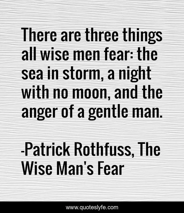 This page presents the quote "There are three things all wise men fear: the sea in storm, a night with no moon, and the anger of a gentle man.". Author of this quote is Patrick Rothfuss, The Wise Man's Fear. This quote is about fear, patrick-rothfuss, name-of-the-wind, wisdom,.