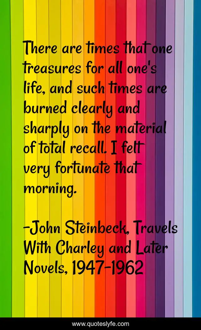 This page presents the quote "There are times that one treasures for all one's life, and such times are burned clearly and sharply on the material of total recall. I felt very fortunate that morning.". Author of this quote is John Steinbeck, Travels With Charley and Later Novels, 1947-1962. This quote is about enthusiasm, happy, inspirational, time,.