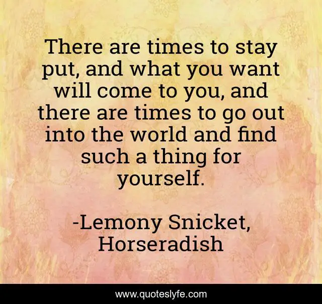 This page presents the quote "There are times to stay put, and what you want will come to you, and there are times to go out into the world and find such a thing for yourself.". Author of this quote is Lemony Snicket, Horseradish. This quote is about patience, life, perseverance, truth, seeking,.
