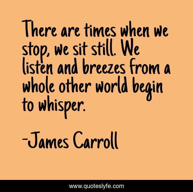 This page presents the quote "There are times when we stop, we sit still. We listen and breezes from a whole other world begin to whisper.". Author of this quote is James Carroll. This quote is about tranquility, meditation, philosophy, inspiration, relaxation,.