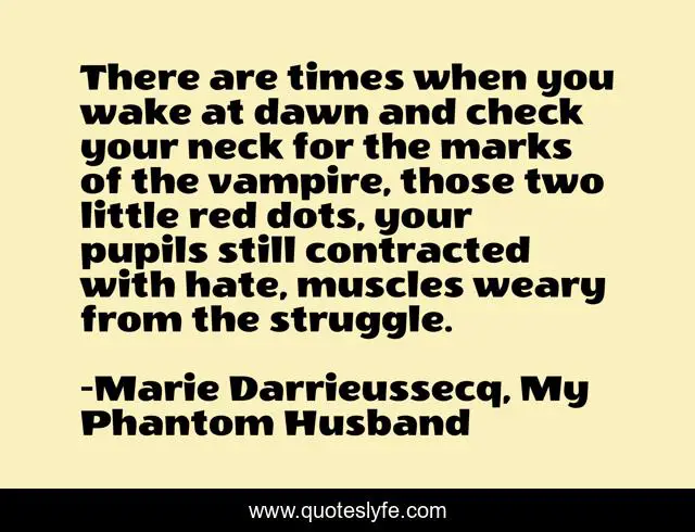 This page presents the quote "There are times when you wake at dawn and check your neck for the marks of the vampire, those two little red dots, your pupils still contracted with hate, muscles weary from the struggle.". Author of this quote is Marie Darrieussecq, My Phantom Husband. This quote is about sleep, vampire,.