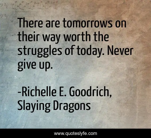This page presents the quote "There are tomorrows on their way worth the struggles of today. Never give up.". Author of this quote is Richelle E. Goodrich, Slaying Dragons. This quote is about keep-going, richelle-e-goodrich, endurance, willpower, fight, try, richelle, endure, don-t-quit,.