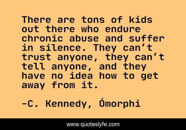 This page presents the quote "There are tons of kids out there who endure chronic abuse and suffer in silence. They can’t trust anyone, they can’t tell anyone, and they have no idea how to get away from it.". Author of this quote is C. Kennedy, Ómorphi. This quote is about abused-children, lgbtq, abuse-survivors, young-adult-romance, young-adult-novels, young-adult-fiction, abuse-recovery, glbtq-romance, glbtq,.