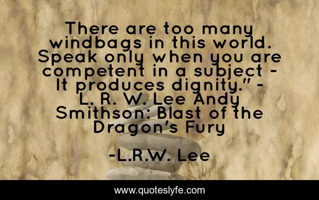 This page presents the quote "There are too many windbags in this world. Speak only when you are competent in a subject - It produces dignity." - L. R. W. Lee Andy Smithson: Blast of the Dragon's Fury". Author of this quote is L.R.W. Lee. This quote is about life-philosophy, inspirational, enthusiasm,.