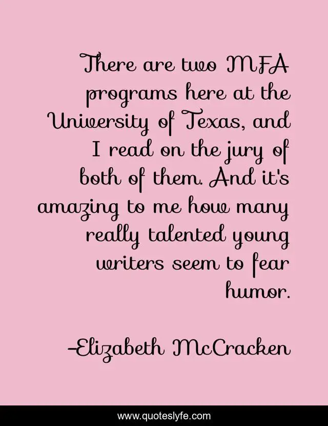 This page presents the quote "There are two MFA programs here at the University of Texas, and I read on the jury of both of them. And it's amazing to me how many really talented young writers seem to fear humor.". Author of this quote is Elizabeth McCracken. This quote is about me, fear, amazing,.