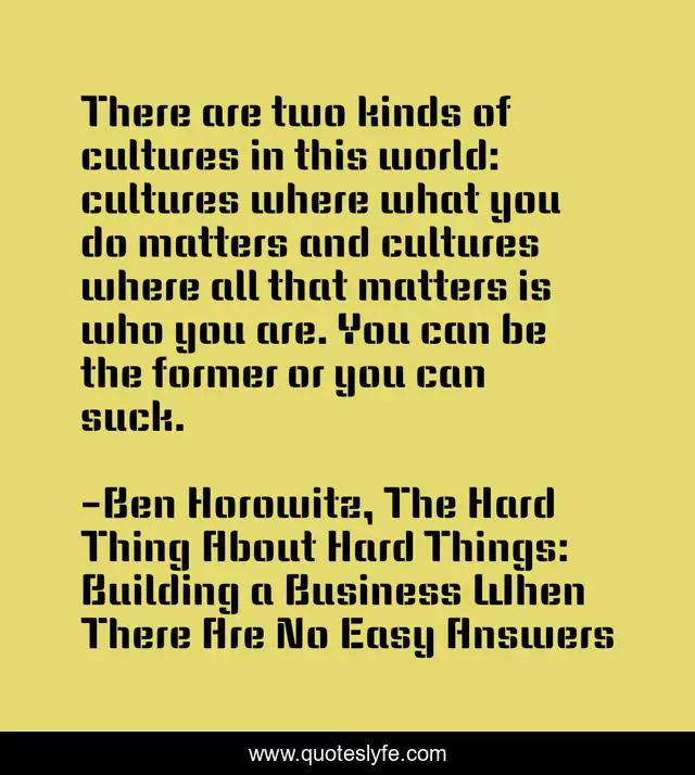 This page presents the quote "There are two kinds of cultures in this world: cultures where what you do matters and cultures where all that matters is who you are. You can be the former or you can suck.". Author of this quote is Ben Horowitz, The Hard Thing About Hard Things: Building a Business When There Are No Easy Answers. .